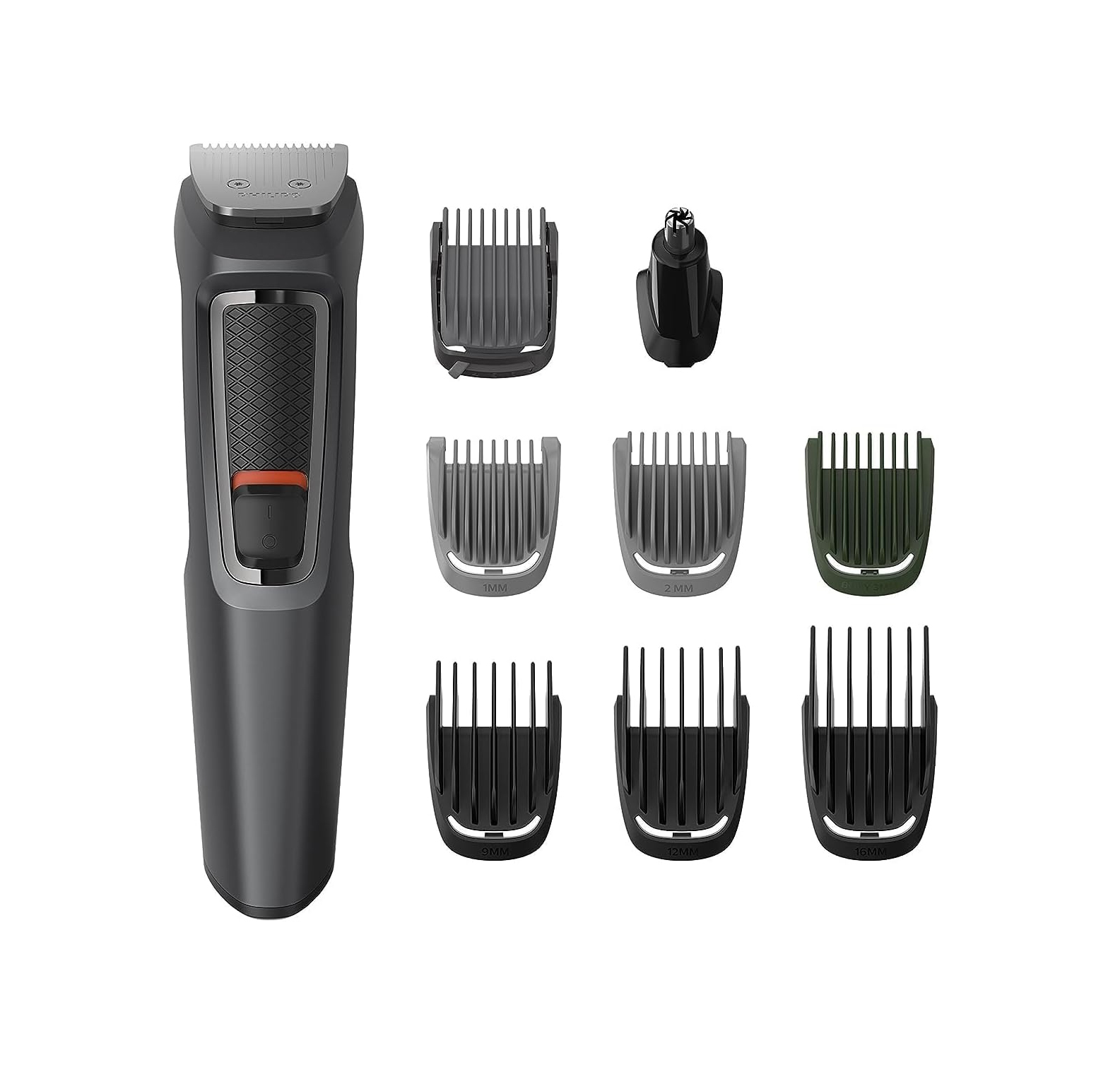 رأس 1 و 2 ملم للوجهرأس قابل للتعديل من 3 إلى 7 ملم لحلاقة الوجهرأس ماكينة الحلاقة (0 ملم)رأس مخصص لشعر الأذن والأنفرؤوس 9 و12 و16 ملم لشعر الرأس